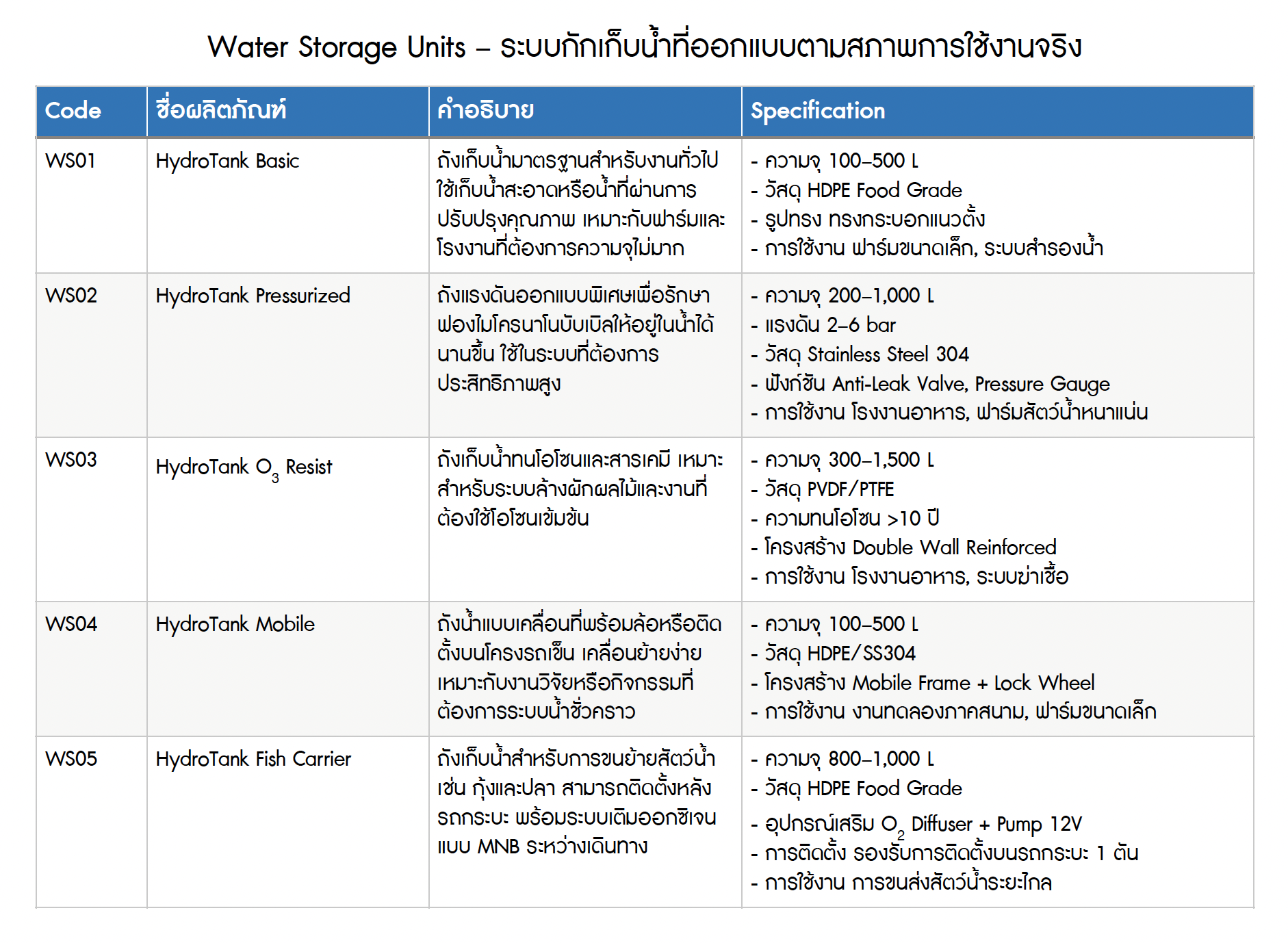 ถังเก็บน้ำที่มีทั้งแบบแรงดันและไม่แรงดัน ผลิตจากวัสดุคุณภาพสูง เช่น สแตนเลสและ PE กึ่งโปร่งแสง ออกแบบเพื่อลดการสูญเสียค่า DO และรักษาคุณภาพน้ำให้นานยิ่งขึ้น เหมาะสำหรับการใช้งานตั้งแต่ฟาร์มเกษตร การเพาะเลี้ยงสัตว์น้ำ ไปจนถึงโรงงานอุตสาหกรรม มีรุ่นพิเศษสำหรับการขนส่งสัตว์น้ำระยะไกล โดยไม่ต้องพึ่งพาถัง O₂ ขนาดใหญ่ ช่วยประหยัดและสะดวกกว่ามาก